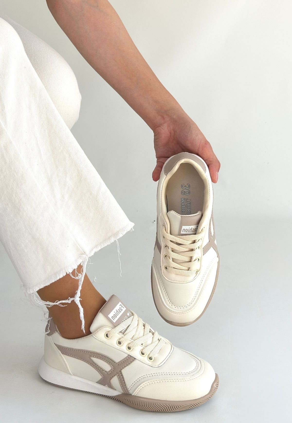 Zlay Bej Cilt Vizon Detaylı Bağcıklı Spor Ayakkabı